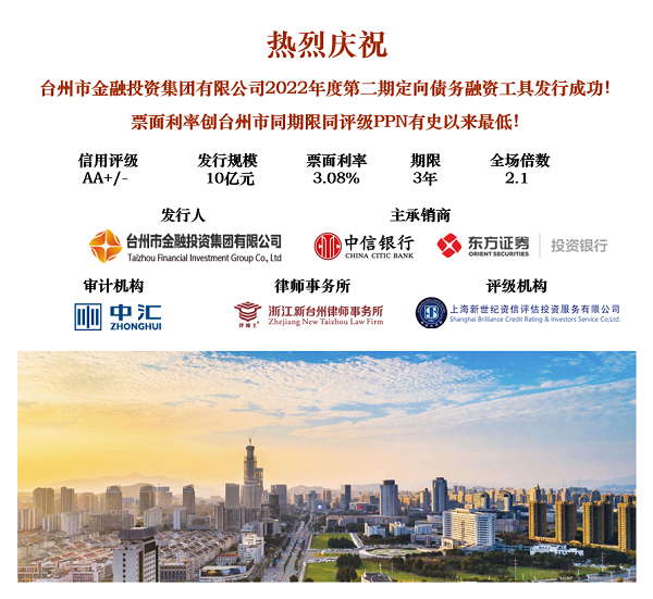 本次PPN主體評級AA+,發(fā)行金額10億元,期限3年,由中信銀行與東方證券擔任聯(lián)席主承銷商,票面利率3.08%,創(chuàng)臺州市同期限同評級PPN有史以來最低。
