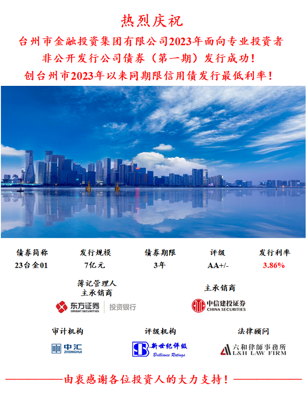2023年4月11日,臺(tái)州市金融投資集團(tuán)有限公司(以下簡(jiǎn)稱市金投集團(tuán))面向?qū)I(yè)投資者第一期非公開發(fā)行公司債券(私募公司債)發(fā)行成功,揭開了市金投集團(tuán)2023年發(fā)債的序幕。