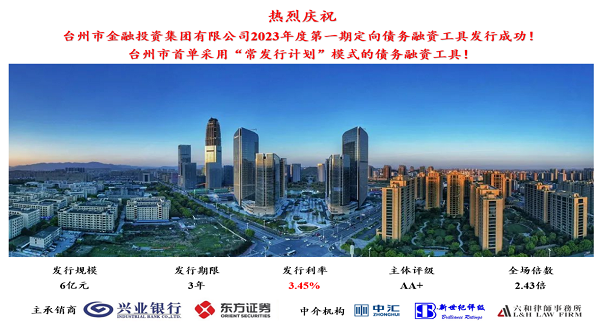 9月4日,市金投集團(tuán)以“常發(fā)行計劃”方式成功發(fā)行6億元定向債務(wù)融資工具,發(fā)行期限3年,發(fā)行利率3.45%,為臺州市首單采用“常發(fā)行計劃”模式發(fā)行的債務(wù)融資工具。