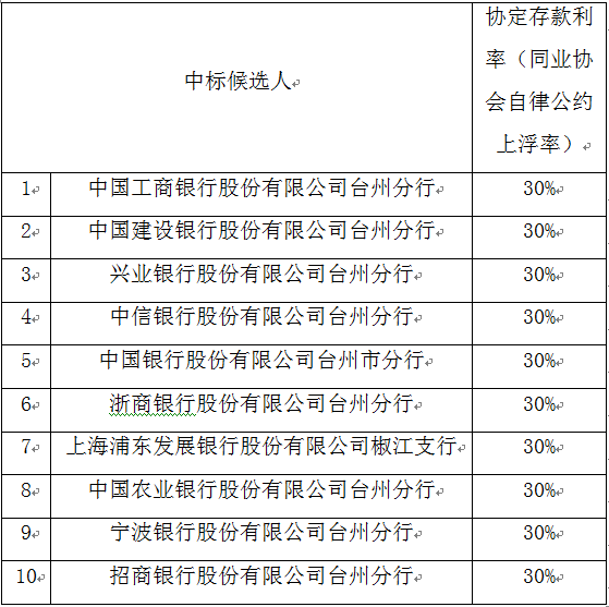 臺(tái)州市金融投資集團(tuán)有限公司(招標(biāo)人), 臺(tái)州市金融投資集團(tuán)有限公司戰(zhàn)略合作銀行及下屬公司存款競(jìng)爭(zhēng)性存放項(xiàng)目,經(jīng)評(píng)標(biāo)委員會(huì)評(píng)審,結(jié)果公示如下: