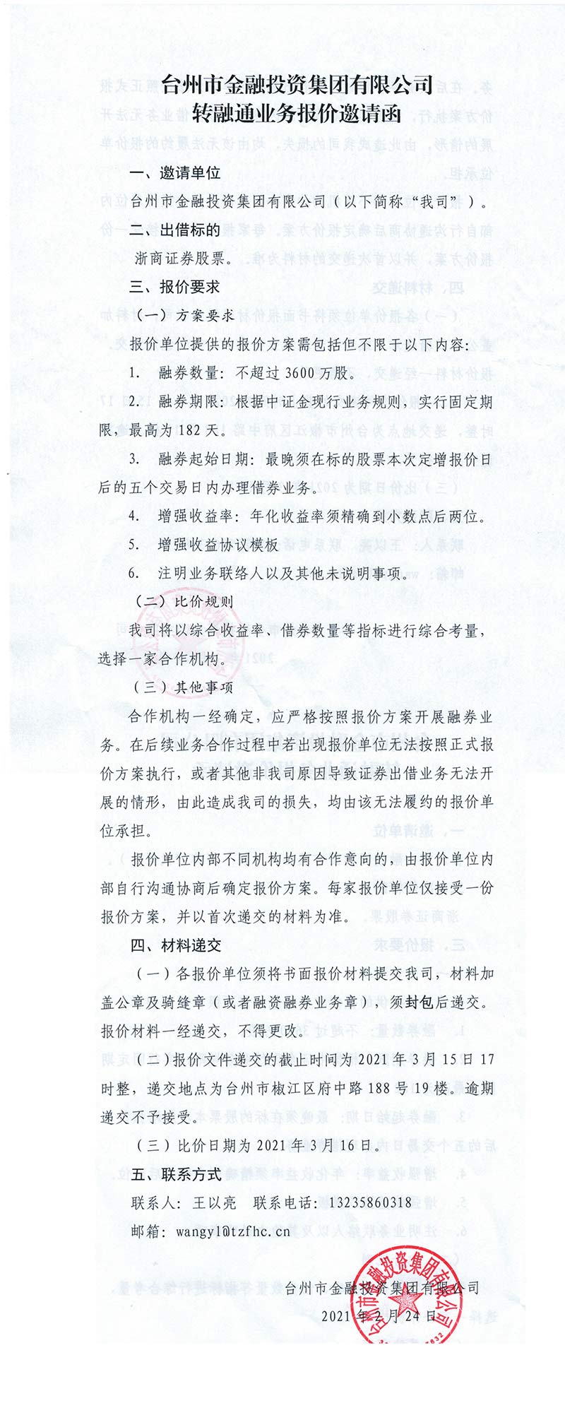 臺州市金融投資集團轉融通業(yè)務報價邀請函(浙商證券股票報價)