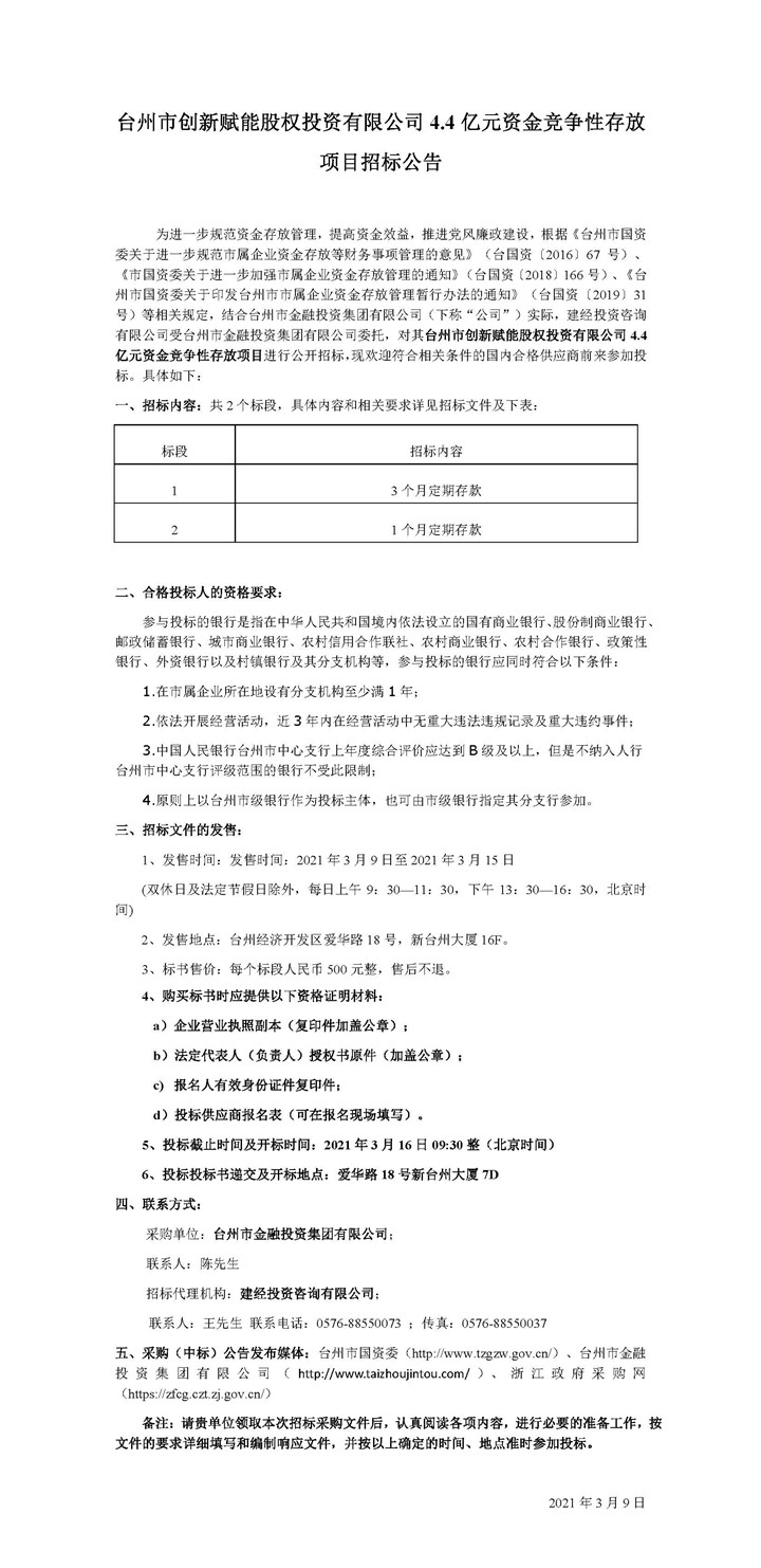 臺州市創(chuàng)新賦能股權(quán)投資有限公司4.4億元資金競爭性存放項目招標公告
