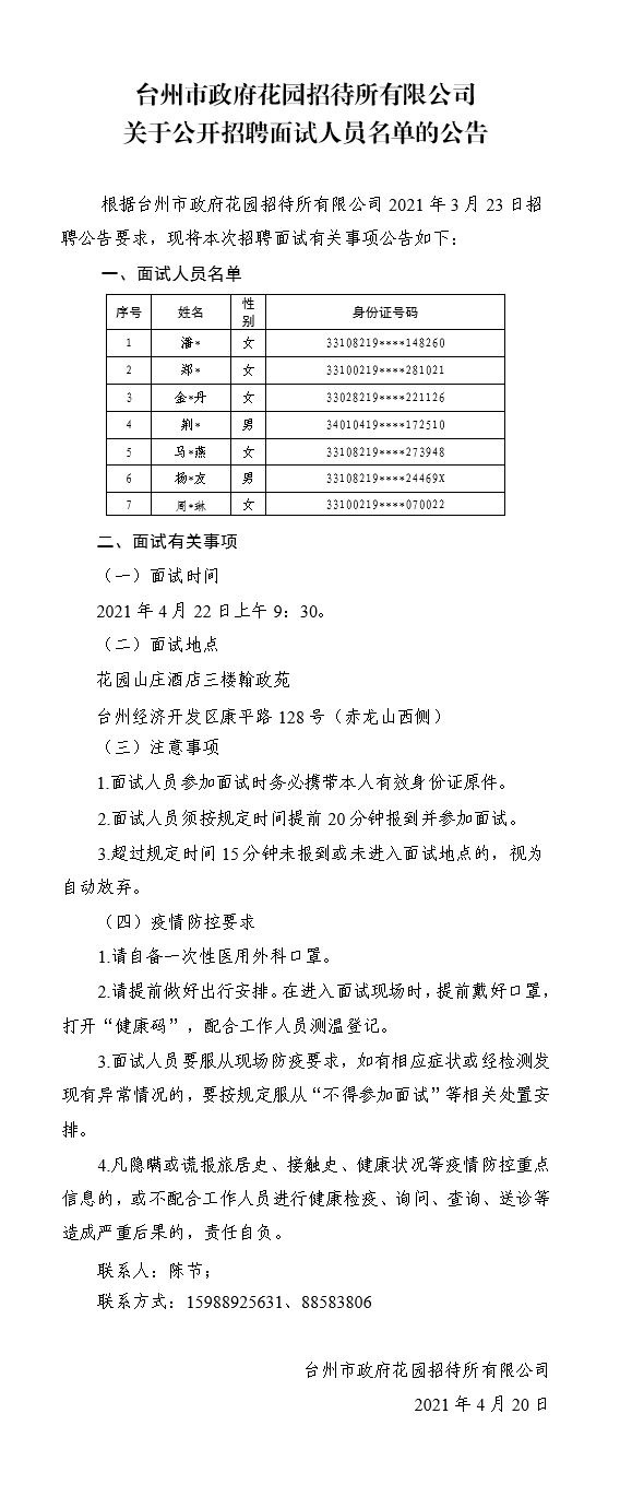 臺州市政府花園招待所有限公司關于公開招聘面試人員名單的公告