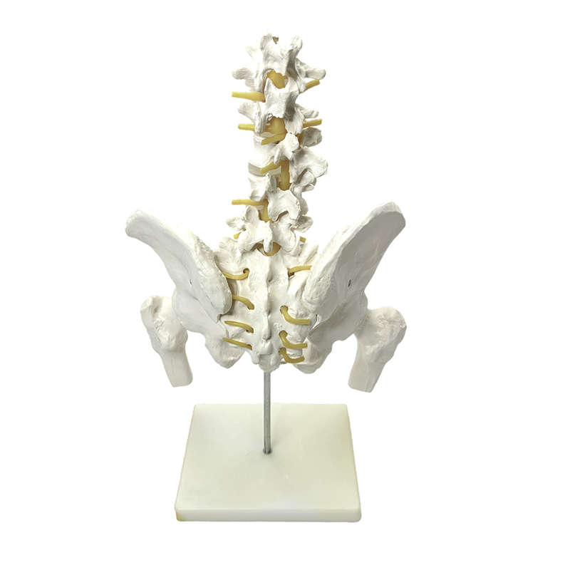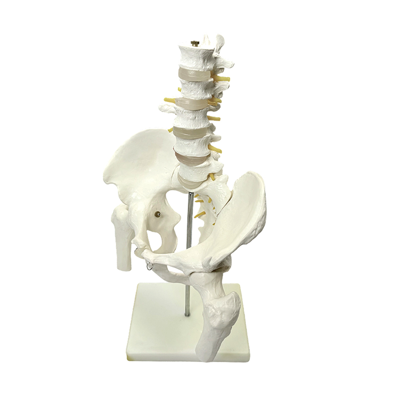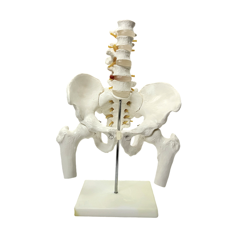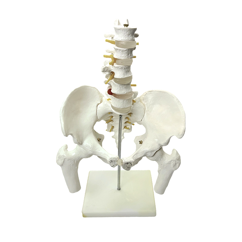 The model includes the hip bone, sacrum, coccyx, femur and five lumbar vertebrae with a demonstration of lumbar disc herniation.