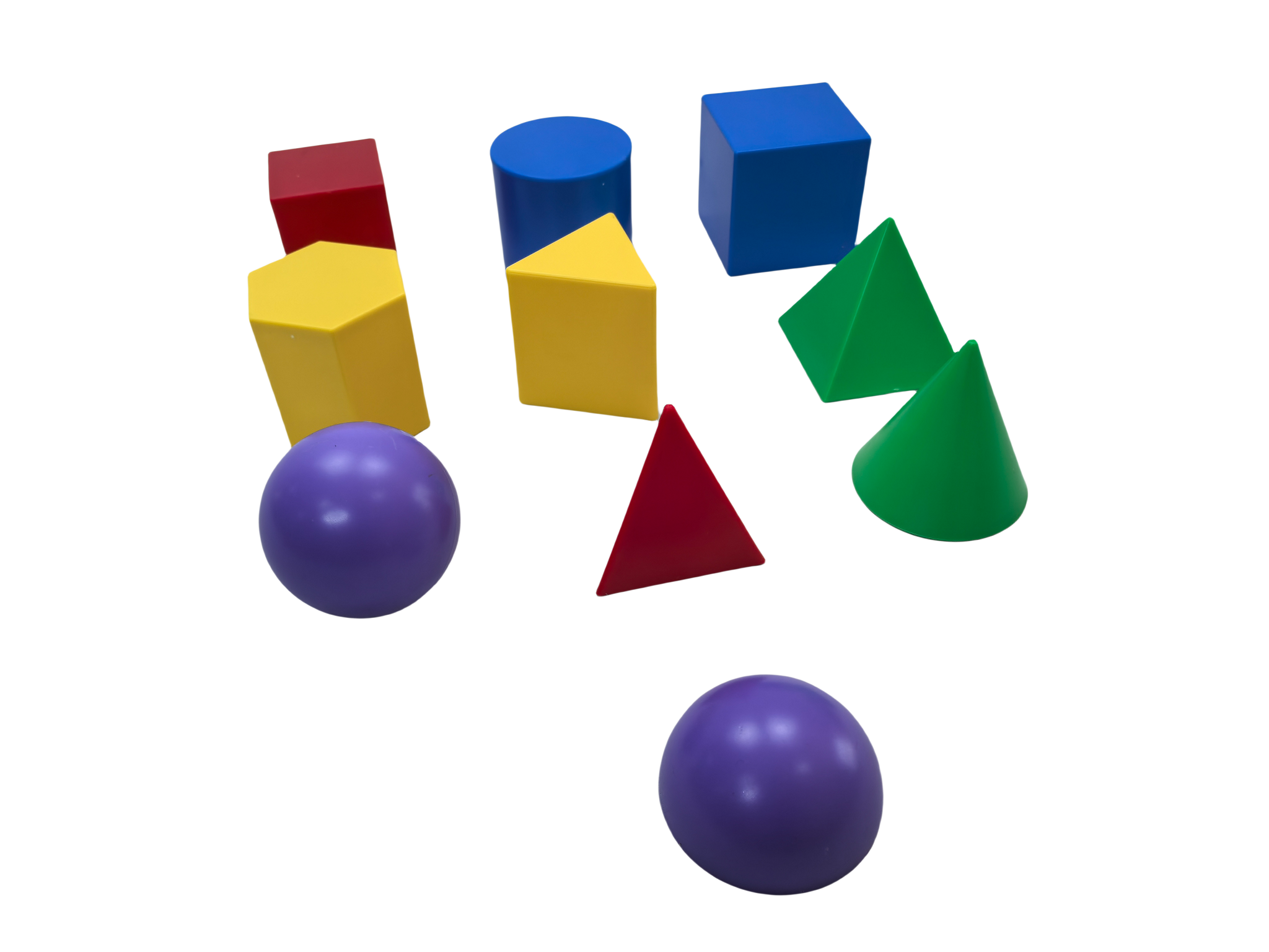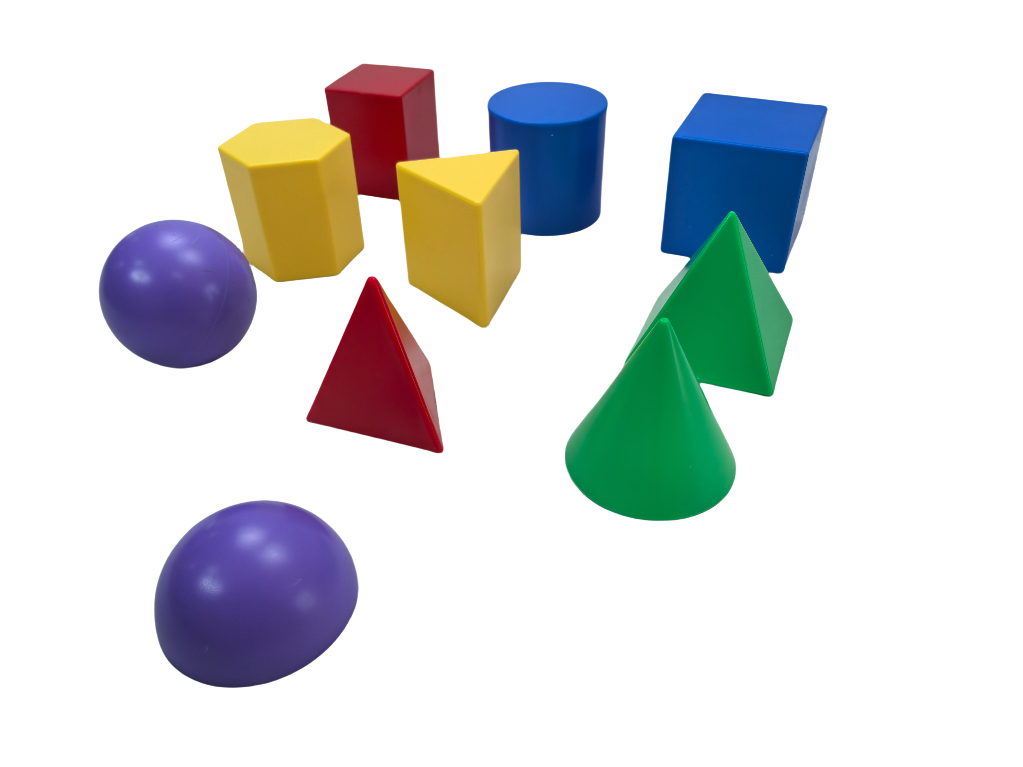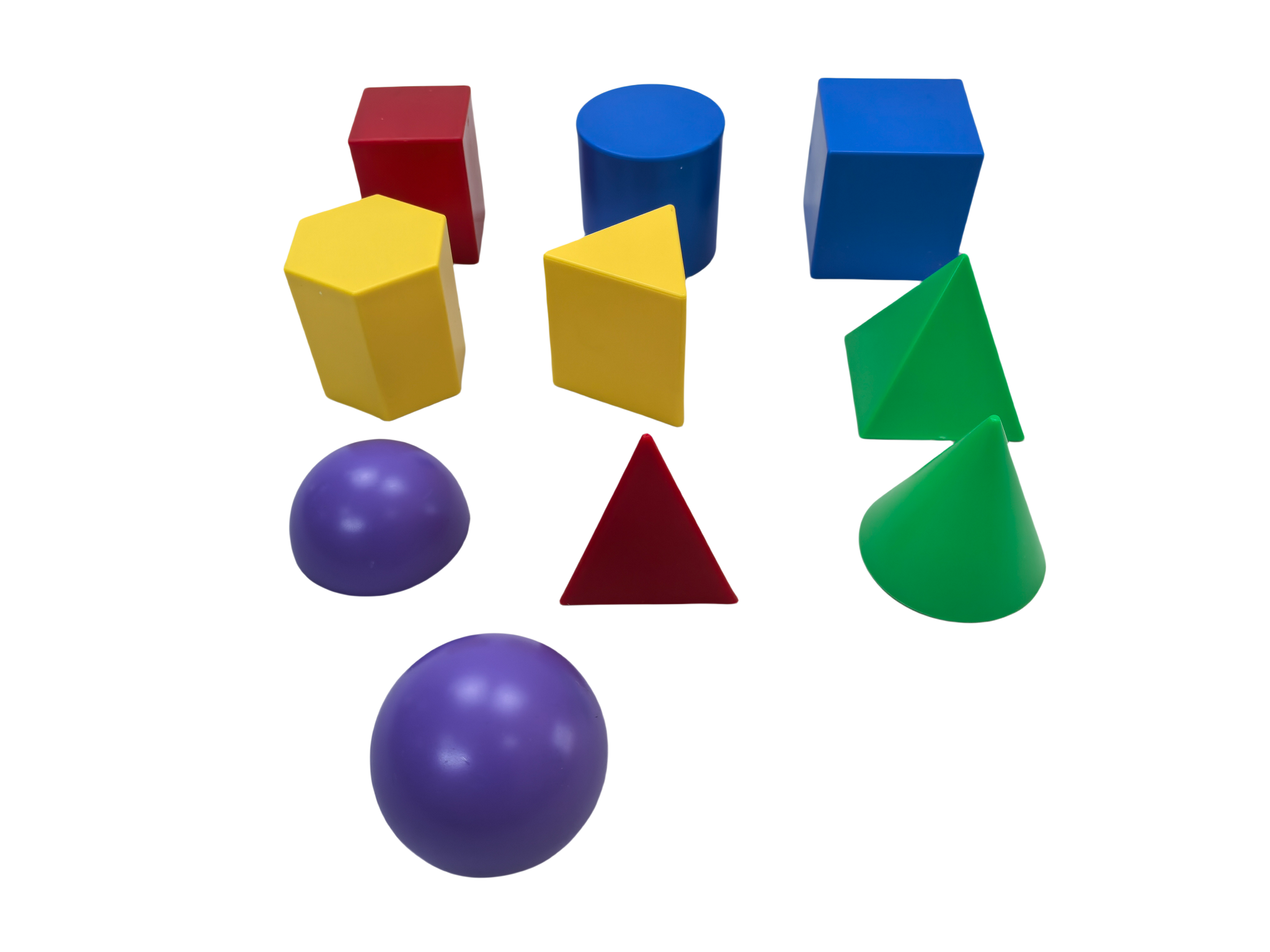 A set of 10 plastic shapes of the same size (side length 7.5 cm): 1 cone, 1 sphere, 1 hemisphere, 1 cube, 1 cylinder, 1 right prism, 1 hexagonal prism, 1 triangular prism, 1 square pyramid, and 1 triangular pyramid