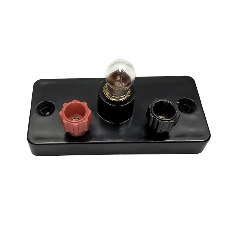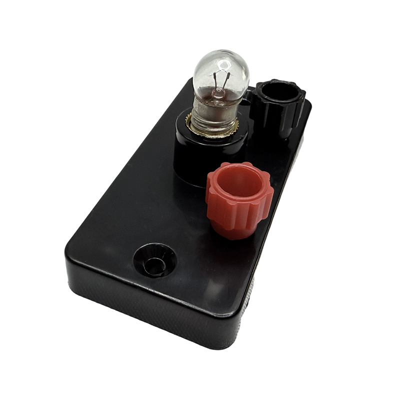 The small lamp holder consists of a base plate, a terminal, and a lamp holder. The small lamp holder and the base are made of black plastic with a smooth surface. It is also equipped with a small light bulb for students' electrical series and parallel circuit experiments.
